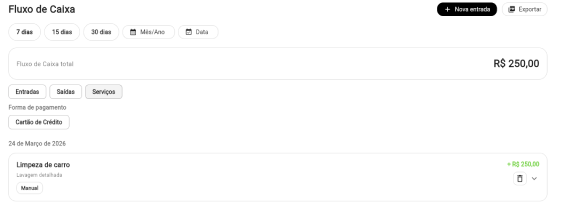 Acompanhe entradas, saidas, custos de serviços e resultados de forma simples sem depender de memória ou anotações soltas.